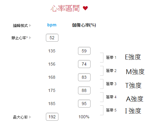 - 只要輸入安靜心率(靜止心率),再更新各強度儲備心率之百分比(%HRR),網頁便會自動更新各區間該達到的心率: