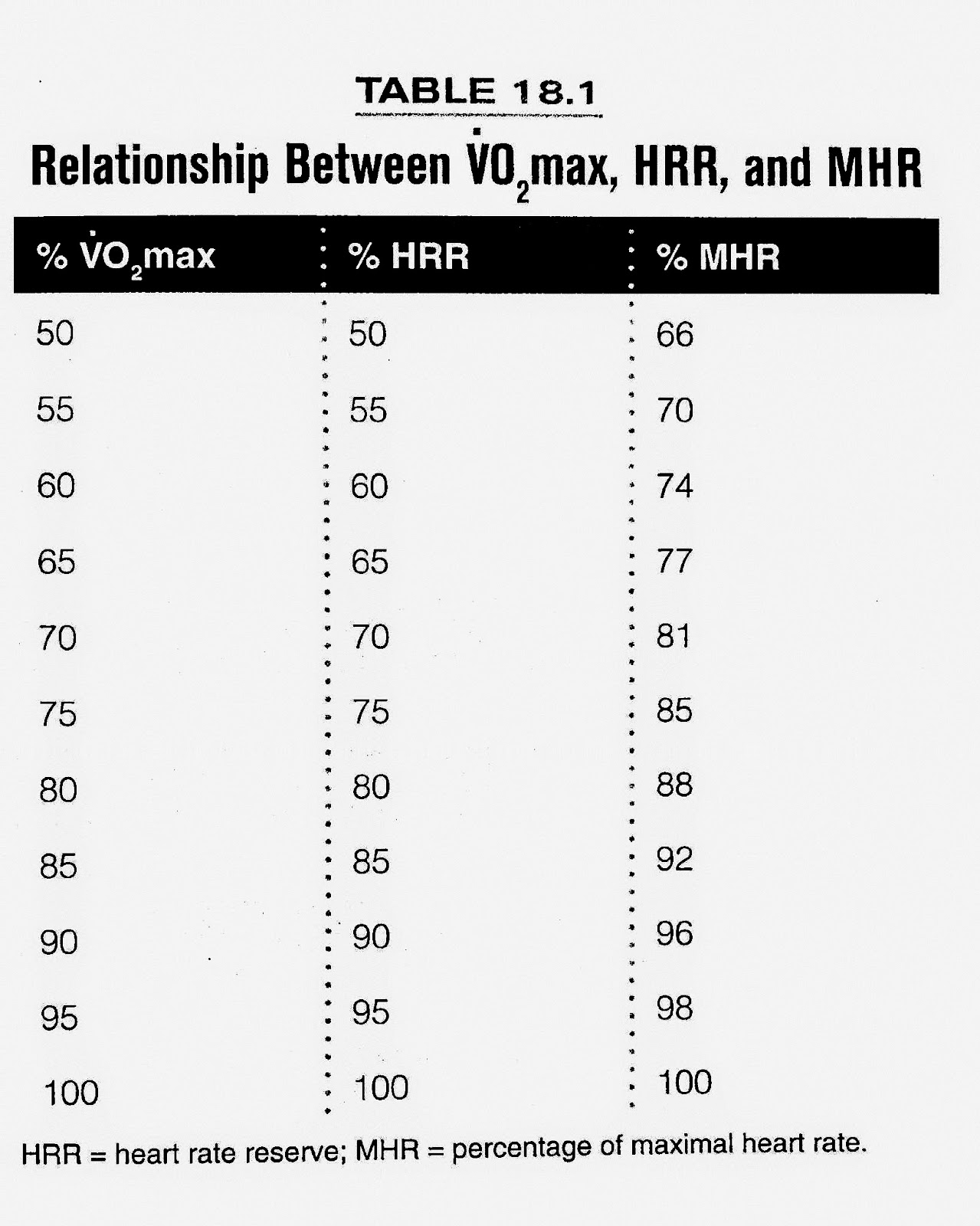 上文提到,NSCA最新版的教科書指出:「心跳率百分比與耗氧量百分比具有高度的關聯性」,其中書上更列出了在不同強度下VO2max、HRR與MHR之間的關係,從表中可見%VO2max與%HRR兩者間的百分比完全吻合: