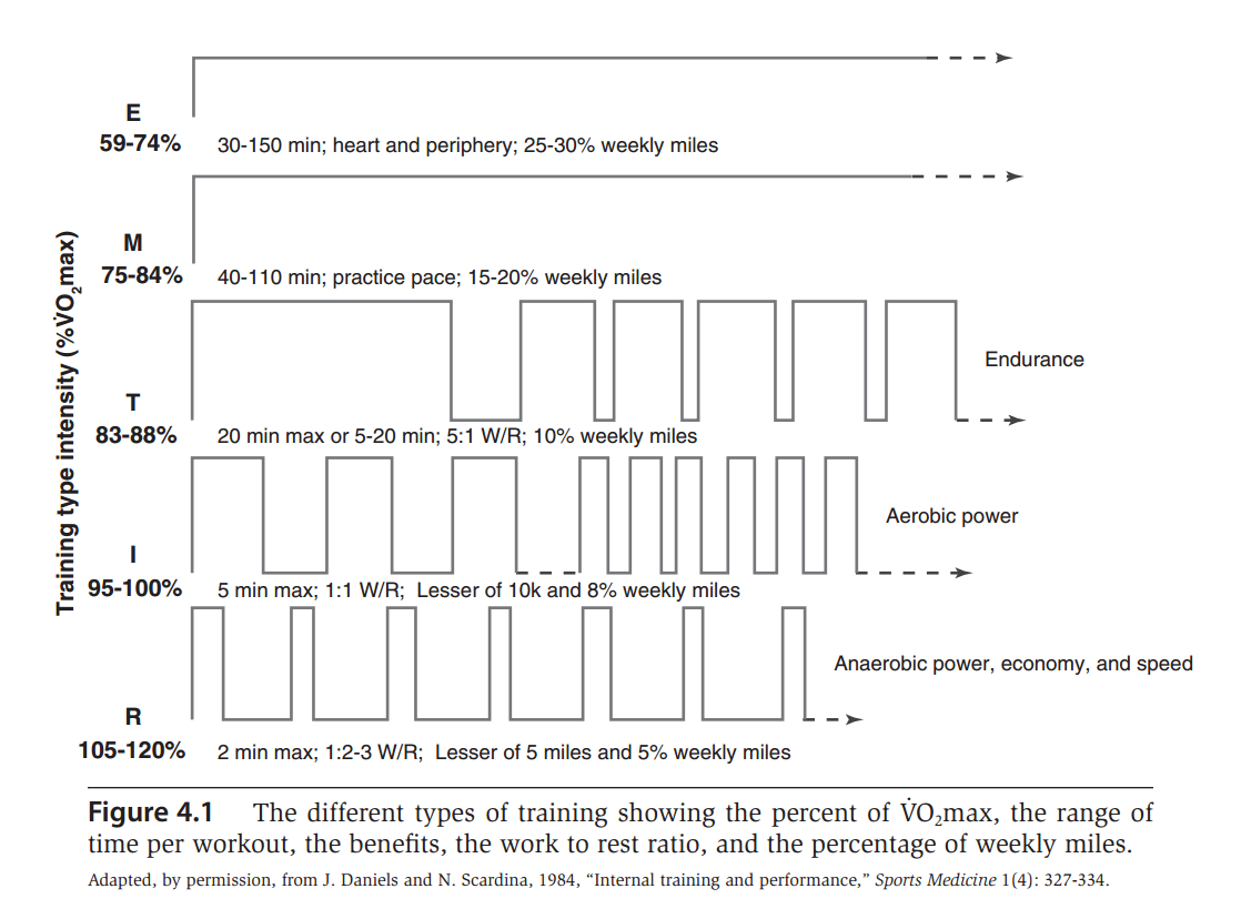 下圖摘自《Daniels’ Running Formula》3rd Edition五種強度所對應的%VO2max: