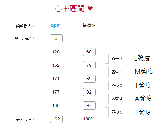 目前在Garmin Connect上的訓練區間設定功能已經十分方便,使用者只要先輸入自己的最大心率、安靜心率、還有各強度區間之百分比後,網頁便會自動幫你計算出各強度的心率各是多少,設定完成後再接上Garmin之相關產品,按「傳送至裝置」就可以跟裝置同步已經設定好的訓練區間;以下為我個人的設定: