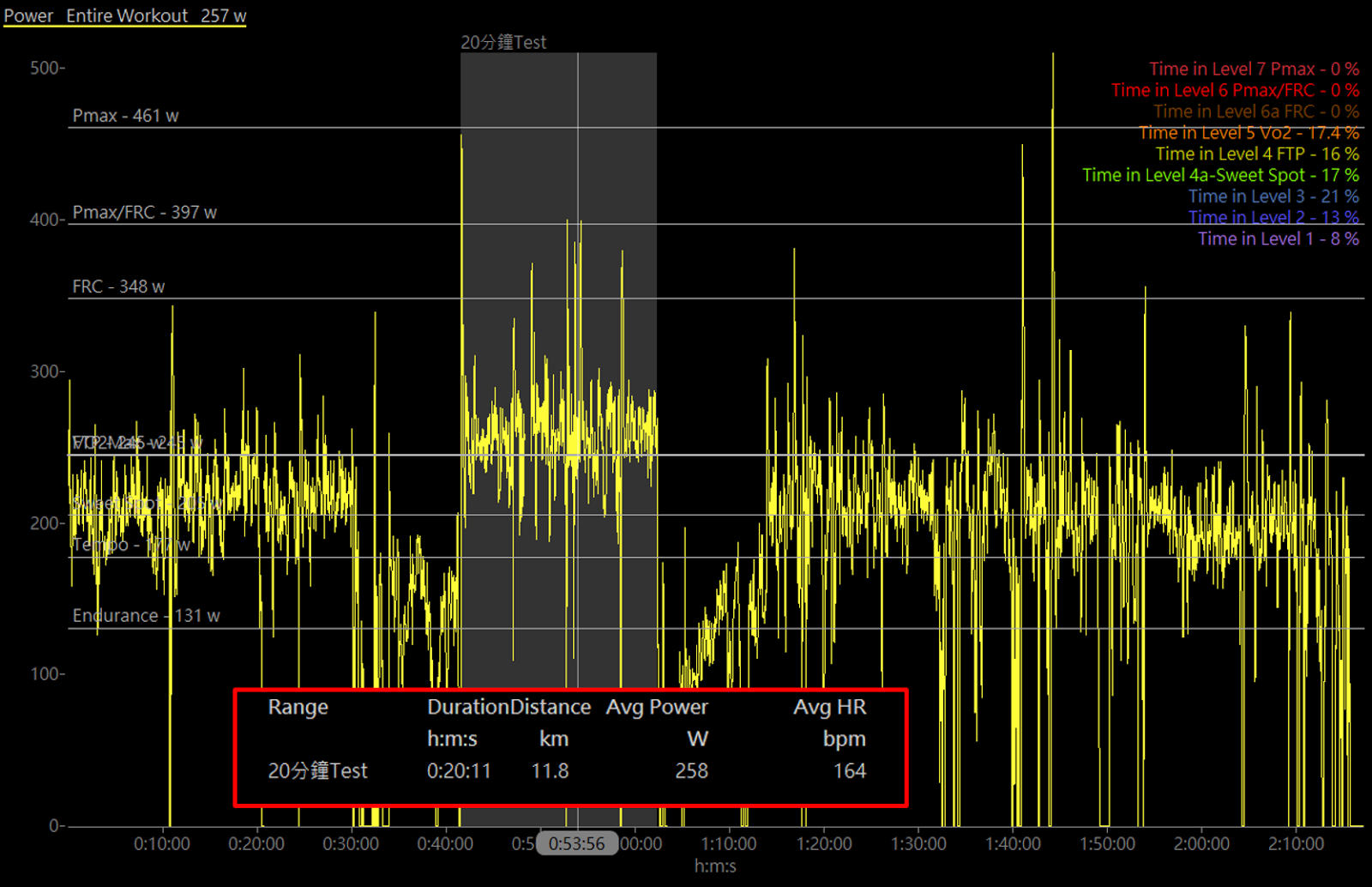 | 20 分鐘最大平均功率 258w,換算 FTP 為 245w(258 x 0.95)。 |